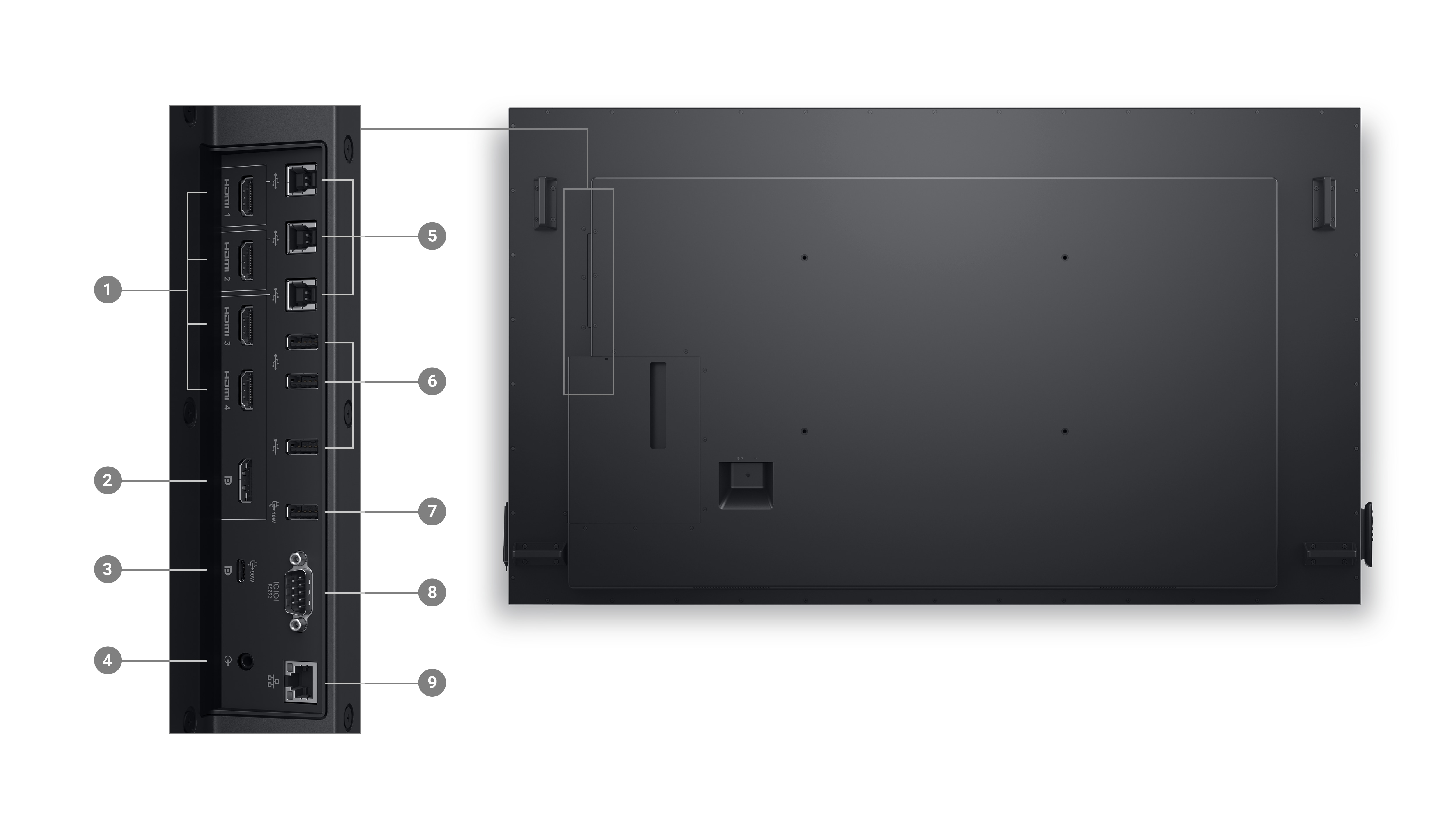 1HDMI x 4 | 2. DisplayPort 1.2 | 3. USB Type-C | 4. Audio line-out | 5. USB 3.1 Upstream x 3 | 6. USB 3.1 Downstream x 3 | 7. USB Charging Port | 8. RS232 connector | 9. RJ45 connector