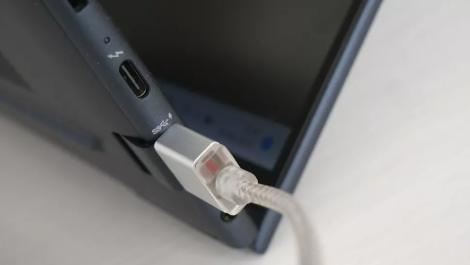 منبع تغذیه 100 واتی USB-C به طور قابل توجهی جمع و جور است و دارای کابل پارچهای با کیفیت بالا است که به امتیاز این لپتاپ میافزاید.
