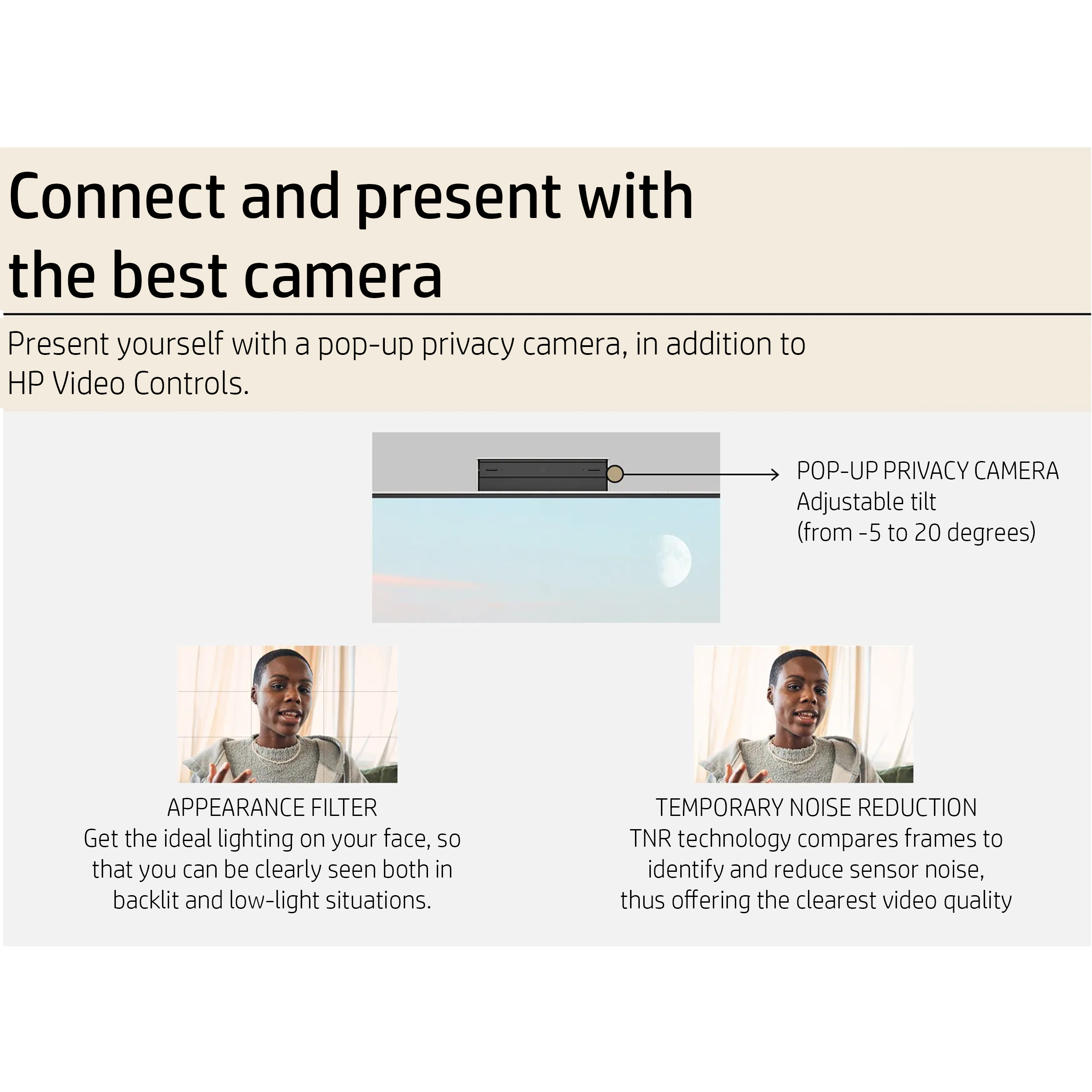 - برای تسهیل همکاری و ارتباطات، این کامپیوتر مجهز به دوربین پاپآپ با قابلیت شیبدهی برای حفظ حریم خصوصی، میکروفونهای دوگانه و فناوری پیشرفته کاهش نویز است.