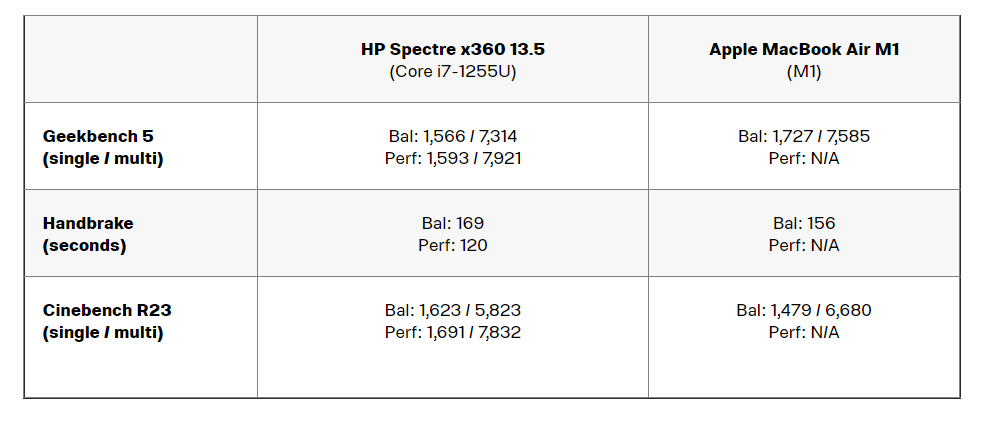 Spectre x360 13.5 از پردازنده Core i7-1255U نسل دوازدهم اینتل 15 واتی استفاده می کند، یک CPU 10 هسته ای/12 رشته ای که مستقیماً لپ تاپ های باریک و سبک را هدف قرار می دهد. MacBook Air M1 از نسل اول پردازنده ARM اپل با هشت هسته CPU و هفت هسته GPU استفاده می کند. این تراشهای است که به اندازهای خنک کار میکند که مکبوک بدون فن و کاملاً بیصدا باشد، در حالی که Spectre فنهایی برای خنک نگه داشتن داخل لپتاپ دارد.