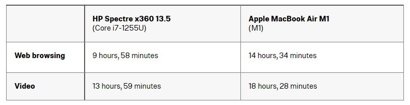 بزرگترین تفاوت Spectre x360 13.5 در عمر باتری است، آن هم به خاطر به صفحه نمایش OLED با رزولوشن بالاتر است. مک بوک ایر M1 از کارایی فوق العاده ARM اپل بهره می برد و عمر باتری بهتری دارد. این تفاوت با Spectre که از پنل IPS با رزولوشن پایینتر استفاده میکند چندان زیاد نخواهد بود، اما MacBook همچنان احتمالاً عمر باتری بیشتری خواهد داشت.