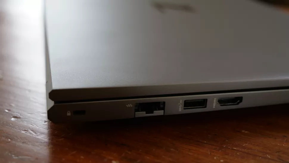 در سمت چپ آن، سه پورت وجود دارد: یک درگاه HDMI 2.0، یک پورت USB Type-A 3.2 Gen 1 و یک درگاه اترنت RJ-45. همچنین میتوانید یک کارتخوان اختیاری و یک اسلات قفل امنیتی را در اختیار داشته باشید.