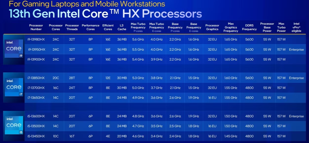 پردازندههای موبایل نسل سیزدهم اینتل برای لپتاپها نسبت به نسل قبلی تغییر زیادی نکرده است، به جز سری جدیدتر CPU HX که در اواسط سال 2022 وارد بازار شدند و عملکردی را ارائه می دهند که می تواند جزء بهترین دسکتاپ ها باشد. اکنون به نظر میرسد HX یکی از بخشهای اصلی خط تولید اینتل باشد و با ۹ تراشه جدید برای نسل سیزدهم عرضه شود.