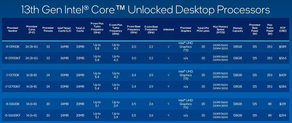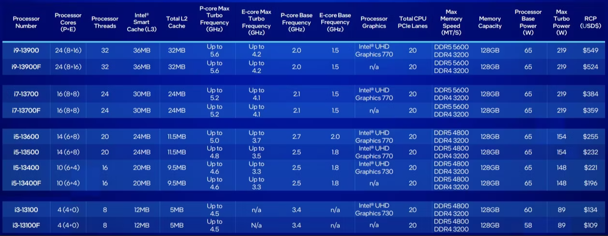 علاوه بر این، تراشههای نسل 13 اینتل در مقایسه با 4800 در نسل دوازدهم، پشتیبانی از DDR5 را تا 5600 افزایش میدهند . همچنین تأیید شده است که پشتیبانی از DDR4 تا 3200 باقی میماند.