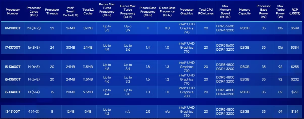 در اینجا نگاهی داریم به تراشه های سری T که هفت مورد از آنها موجود است. همه آنها با گرافیک 770 اینتل UHD یکپارچه عرضه می شوند و از Core i3 تا Core i9 را شامل می شوند.