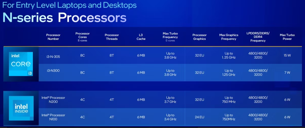 در نهایت، اینتل همچنین تعدادی پردازنده جدید سری N برای نمایش دارد. چهار CPU جدید از هستههای Gracemont استفاده میکنند و با فرآیند Intel 7 ساخته شدهاند، اگرچه هستههای Performance ندارند. در عوض، میتوانید تا 8 هسته کارآمد و 8 رشته با عملکرد نسبتاً بالا داشته باشید. اینتل ادعا میکند که این تراشههای سری N جدید میتوانند ۲۸ درصد افزایش عملکرد اپلیکیشن و ۶۴ درصد افزایش عملکرد گرافیکی را نسبت به نسل گذشته مدیریت کنند.