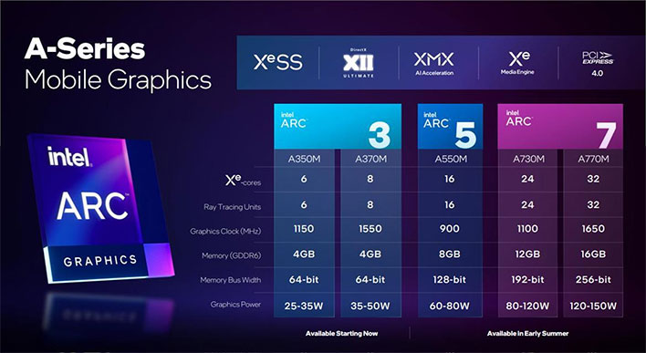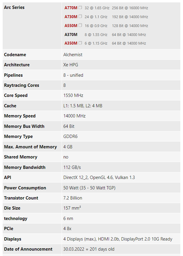 یک کارت گرافیک اختصاصی برای لپتاپهای مبتنی بر ریزمعماری Xe HPG است. A370M از تراشه ACM-G11 استفاده می کند، 8 هسته ای Xe (128 ALU) و یک گذرگاه حافظه 64 بیتی برای 4 گیگابایت حافظه گرافیکی GDDR6 را ارائه می دهد. این تراشه دارای 7.2 میلیارد ترانزیستور است و ابعاد آن 157 میلیمتر مربع است.