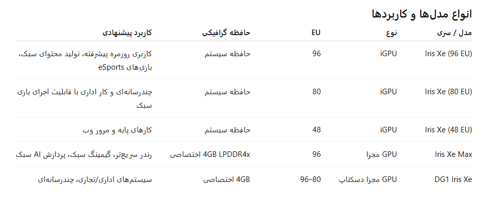 - کاربر عمومی / اداری: iGPU Iris Xe (80 یا 96 EU) کافی است.