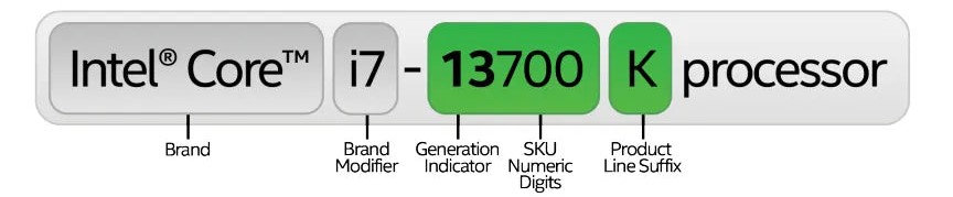 Intel در گذشته، شماره نسل پردازنده را هم به صورت جداگانه درابتدای نام محصول و هم در شماره محصول بعد از مدل آن (i5, i7, i9) قرار میداد. به عنوان مثال: "Intel 14th-gen Core i5-14600K"