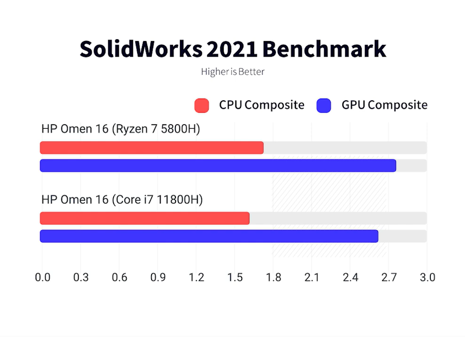اما توی تست نرم افزار SolidWorks ، لپتاپ ای ام دی بهتر عمل میکنه... اینجا داریم میبینیم که هم از نظر گرافیک همپردازنده، ای ام دی ۵ تا ۶ درصد بهتر از لپتاپ اینتل و انویدیاست...