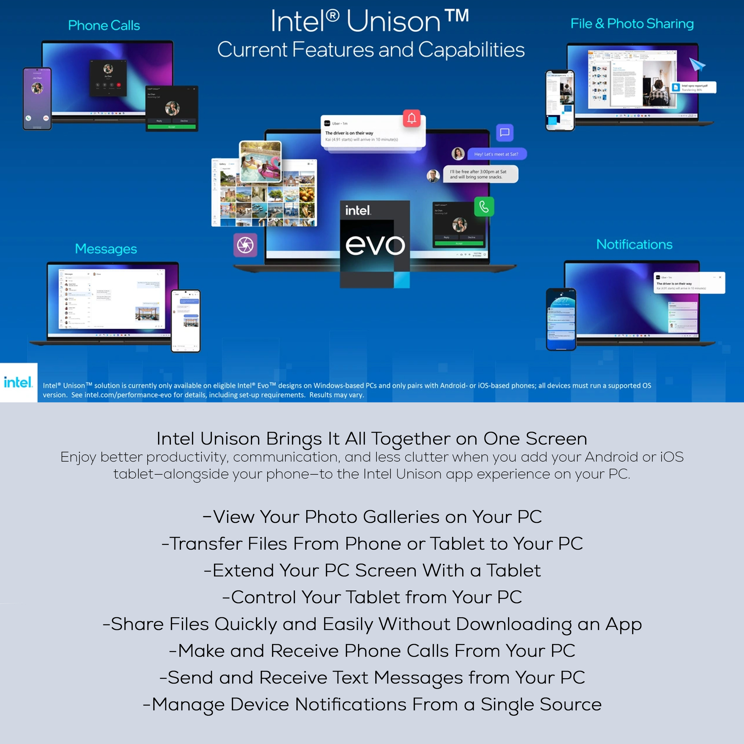 - دارای برنامه Intel Unison مخصوص سری لپ تاپ های محدود Intel EVO با پردازنده های نسل 13 به بالا با امکان هماهنگ سازی گوشی های هوشمند اندروید و ios جهت نمایش محتوای گالری، انتقال اطلاعات دو طرفه بدون نیاز به اپلیکیشن، نمایش تصاویر لپ تاپ روی گوشی و بلعکس، امکان کنترل تبلت از روی لپ تاپ، اشتراک گذاری فایل ها بین گوشی و لپ تاپ و بلعکس، دریافت Notification، پیام و تماس های دریافتی بر روی لپ تاپ (در سیستم عامل ios برخی ازین امکانات متفاوت می باشد)